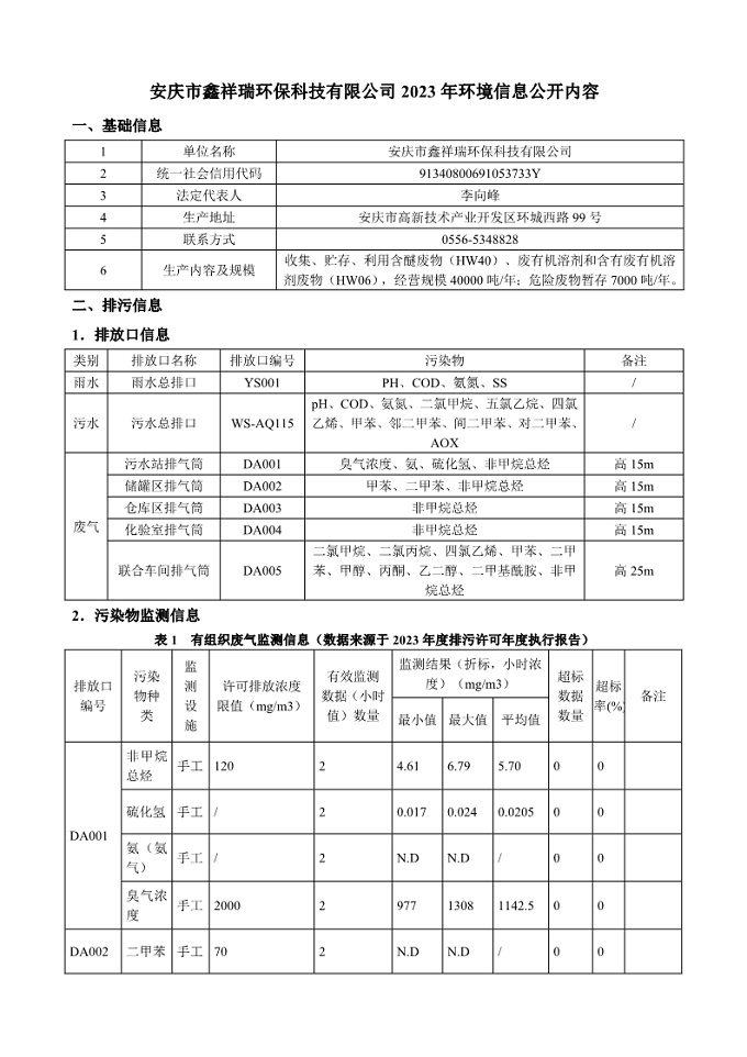 安慶市鑫祥瑞環(huán)??萍加邢薰?023年環(huán)境信息公開內(nèi)容